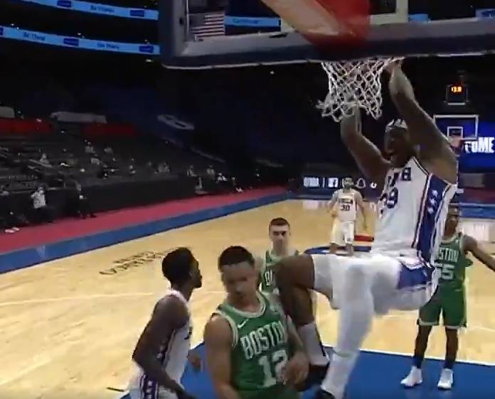 比赛首节,谢克-米尔顿突破吸引防守后,送出一记空接妙传,霍华德拍马赶到双手暴扣得手,成功拿下他在76人生涯的季前赛首球。