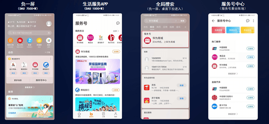 2020年大会,华为推出华为服务号。商家通过接入服务号平台,即可实现消息推送通过华为手机负一屏、生活服务App等入口精准触达用户,帮助用户即时获取服务、优惠信息。