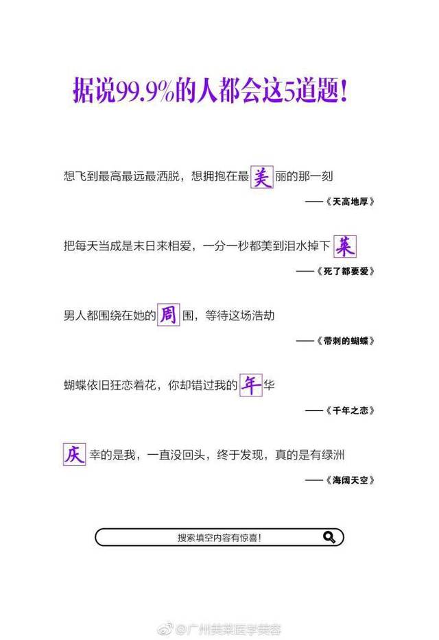 广州美莱是这样干的:整个广告画面只写上明星嘉宾信的五首歌的歌词,每句词挖空其中一个字,而这五个字顺序连起来就是“美莱周年庆”,真正的广告内容,这才浮出水面!