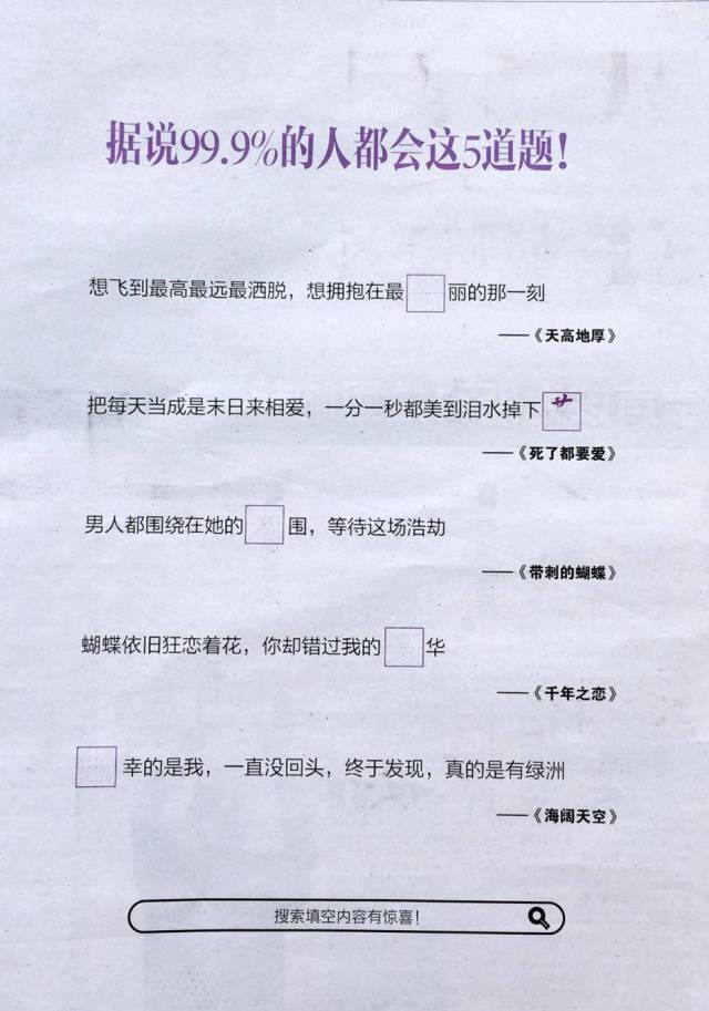 没有明星头像,没有明星名字,没有一句广告词,而将答案隐藏在五个歌词的填空格里,让读者自己主动发现答案,发现广告词,既符合广告法的规定,又足够挑起读者的好奇心,可谓一箭双雕,天衣无缝!