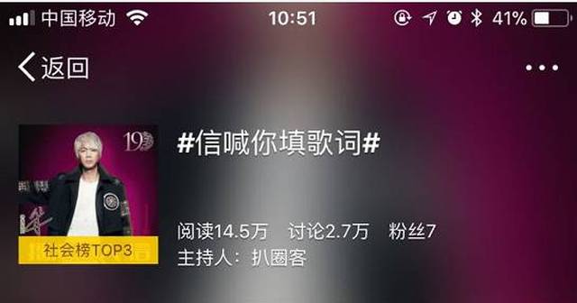由于神广告是用明星——信的歌词作为内容,报纸一发行,立马就有粉丝发现并发上微博,粉丝们纷纷转发助力爱豆,#信喊你填歌词#话题瞬间登上微博话题排行榜第三!目前线万。