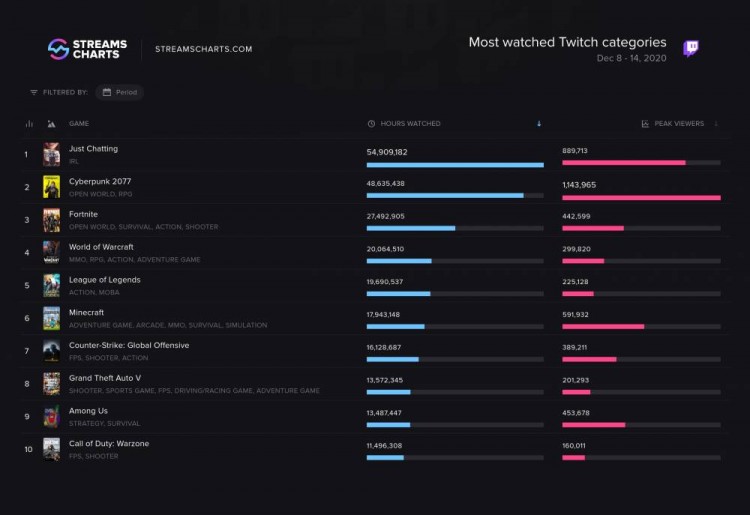 此外在12月10日上线的《赛博朋克2077》凭借超高人气空降第二,观众峰值达到了将近115万人。《堡垒之夜》位列第三,《魔兽世界》第四,而休赛季的《英雄联盟》则是跌至第五。