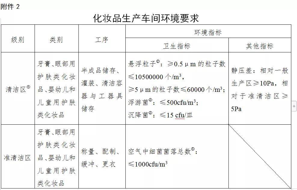根据《化妆品生产许可检查要点》的相关规定,要求婴儿和儿童用护肤类化妆品的半成品存储间、灌装间、清洁容器存储间应达到30万级洁净。今年9月国家药监局发布的《化妆品生产质量管理规范(征求意见稿)》中再次明确了婴幼儿和儿童用护肤类化妆品生产车间清洁区和准清洁区的卫生指标。据了解,清洁区的设计、建造、运行等需参照《GB 50457 医药工业洁净厂房设计标准》执行。
