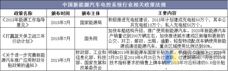 新能源汽车顺应了节能环保的发展趋势,在中国政府的扶持下得到快速应用,市场占有率不断提升,进而带动其配套电控系统行业的迅猛发展。中国政府颁布了一系列利好政策扶持新能源汽车电控系统行业发展,主要从以下两个方面体现:推动中国新能源汽车电控系统行业健康有序成长;支持新能源汽车产业的培育,扩大新能源汽车电控系统行业的市场需求。