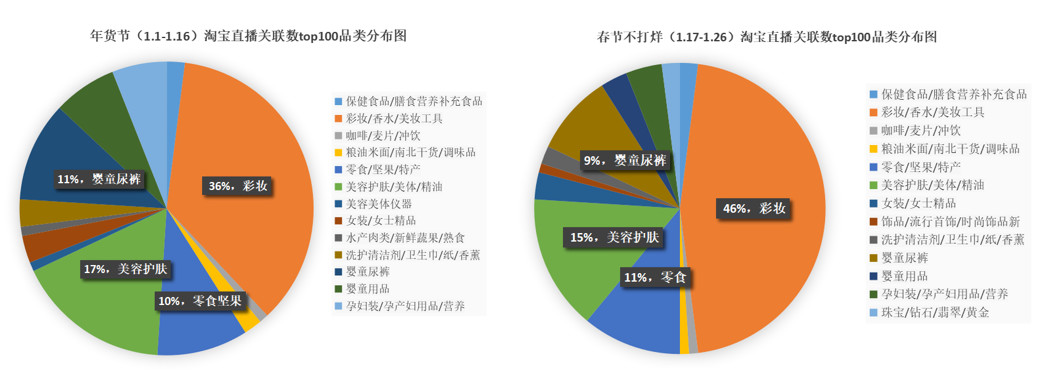 根据知瓜数据商品关联直播数,在年货节期间,彩妆、护肤、婴童、零食这四大类占据了绝大部分直播间,美妆类产品的直播占比仍旧是最多的。