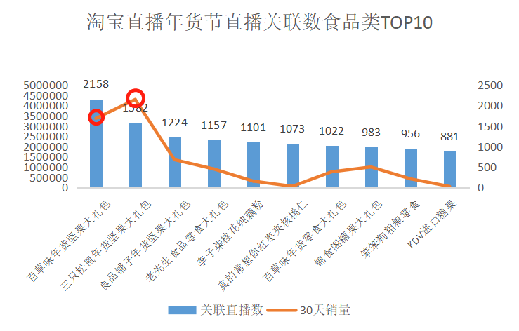 从直播数据看,年货节期间,百草味和三只松鼠也是直播关联数最多的两款年货品牌,而销量也跟随直播数走高。