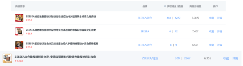 当然,这对于其他品牌来说也是一种挑战,比如滋色的这款安德森眼影盘,直播场数多但销量表现一般,与他们的最火单品晚安粉差距甚大。究其原因可能有两点:
