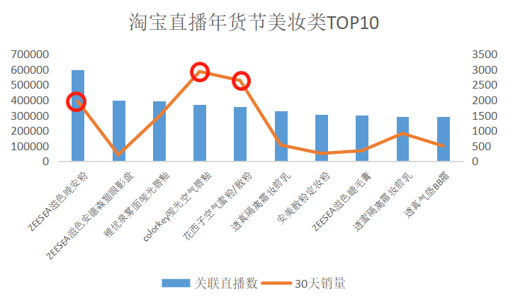 女性作为购物的主力军,美妆类品牌在社交媒体上的存在感一直较高,顶流李佳琦也是“口红”出圈,而国货美妆品牌在社媒平台上的表现更是突出。根据知瓜数据显示,年货节期间淘宝直播关联数美妆类top10榜单上,滋色、colorkey、花西子这三个新锐国产美妆品牌单品直播均得到了不错的正反馈。