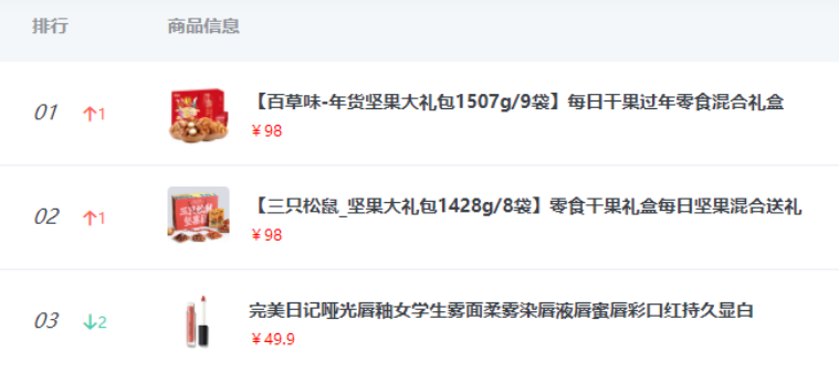 借助年关这一特殊节点,年货商品表现强劲,根据知瓜数据监测,1月份的爆品TOP3的分别是:百草味坚果礼包、三只松鼠坚果礼包和完美日记唇釉。