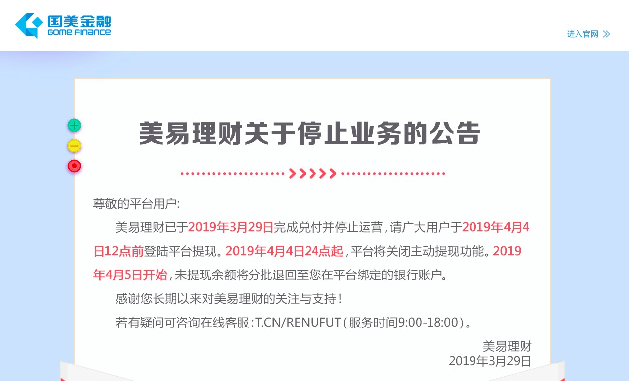 公告称,美易理财已于2019年3月29日完成兑付并停止运营,请广大用户于2019年4月4日12点前登陆平台提现。2019年4月4日24点起,平台将关闭主动提现功能。2019年4月5日开始,未提现余额将分批退回至您在平台绑定的银行账户。