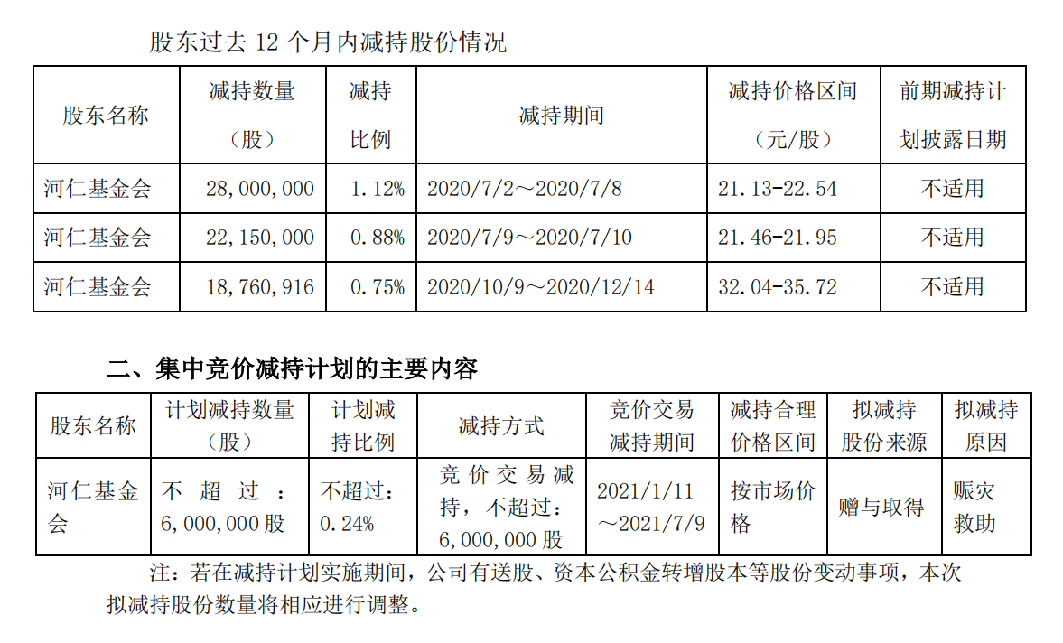 今年下半年至今,河仁慈善基金会已三次减持福耀玻璃。这三次操作累计减持6891万股,按减持时的股价区间计算,其累计套现大约17亿元,减持均价约为25元/股。自今年二季度开始,福耀玻璃展开一轮上攻,11月5日盘中最高上攻至44.33元,刷新历史高点,此后出现一定的回落。目前河仁慈善基金会仍持有福耀玻璃2.21亿股,占总股本的8.81%,市值超过80亿元。