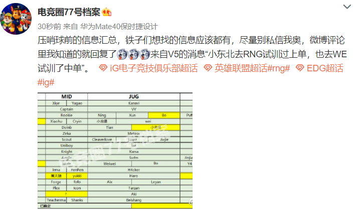 压哨球前的信息汇总,铁子们想找的信息应该都有,尽量别私信我奥,微博评论里我知道的就回复了 来自V5的消息“小东北去RNG试训过上单,也去WE试训了中单”。