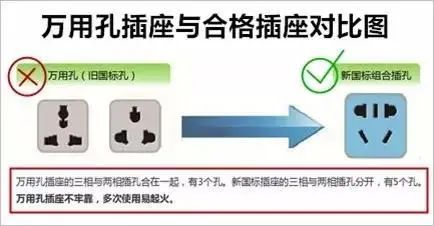 一定要购买新国标插座,不要选购国家禁止生产的万用孔插座。新国标插座的三相插孔与两相插孔分开,有5个孔;万用孔插座的三相插孔与两相插孔合在一起,有3个孔。