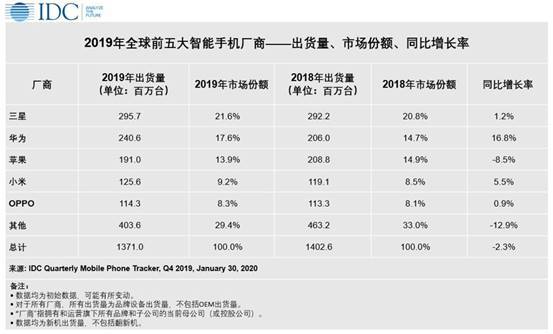 2019年四季度,全球智能手机总出货量为3.688亿部,同比下滑1.1%,各大研究机构认为市场下滑源于中国市场需求疲软,但背后更主要的逻辑是,四季度国产厂商都在为2020年初抢占5G高地进行蓄势。