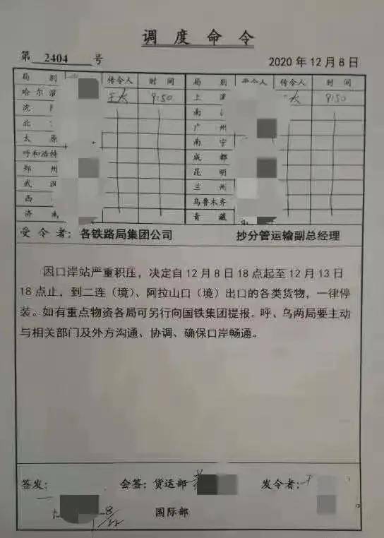 12月8日,铁路总局货调发布最新文本命令:因口岸站积压, 自12月8日18:00起到13日18:00止,全路装到二连(境)、阿拉山口(境)出口的各类货物一律停装 。
