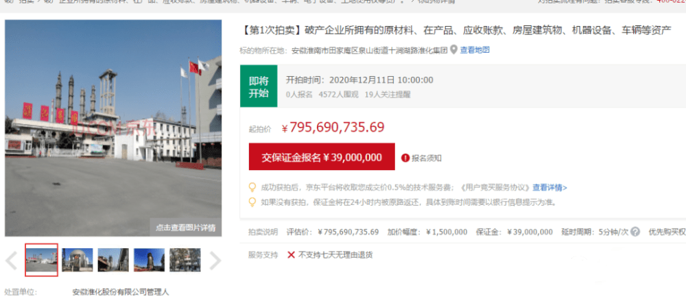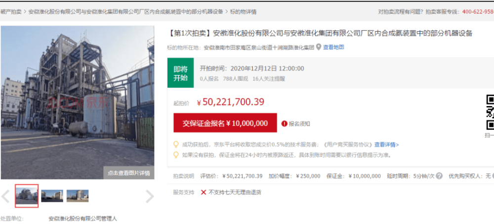 拥有62年历史的安徽淮化集团管理人宣布,将于2020年12月12日12时至2020年12月13日12时止(延时除外)在京东拍卖破产强清平台进行公开拍卖活动。拍品既包括设备实物等有形资产,也包括股权、知识产权等无形资产。其中一项破产企业所拥有的原材料、产品、应收账款、房屋建筑物、机器设备、车辆等资产,起拍价近8亿元。