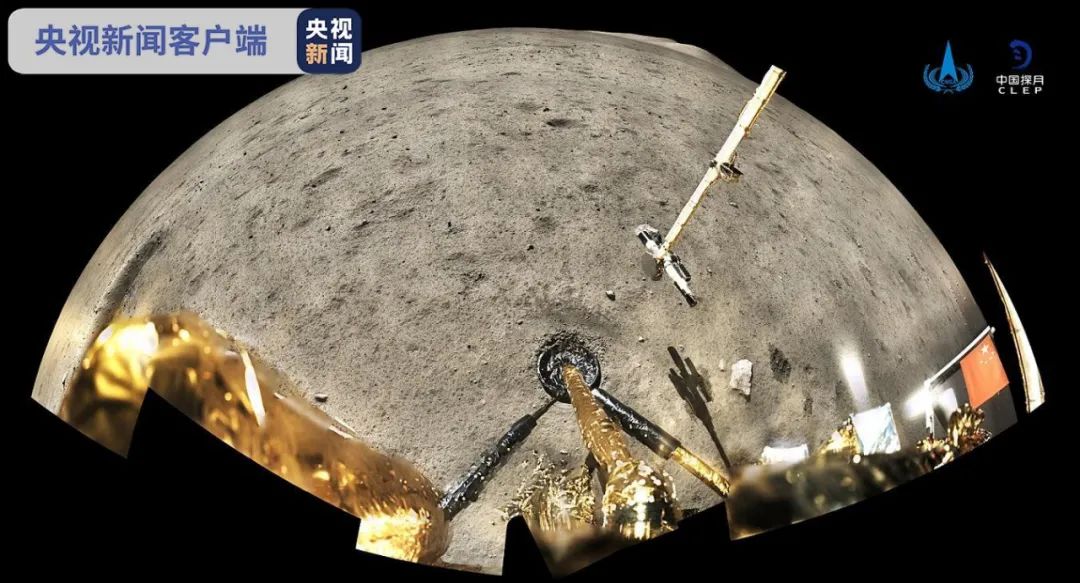 △嫦娥五号着陆器和上升器组合体全景相机环拍成像,五星红旗在月面成功展开,此外图像上方可见已完成表取采样的机械臂及采样器