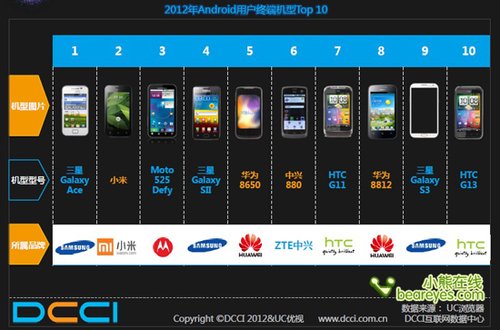 报告同时揭示了目前国内最流行的十大安卓手机机型。其中前四席三星占据两席,分别是排名第一的三星GALAXY ACE和排名第四的三星GALAXY SII,去年发布的小米手机表现出色,排名第二,MOTO 525 DEFY则排名第三。