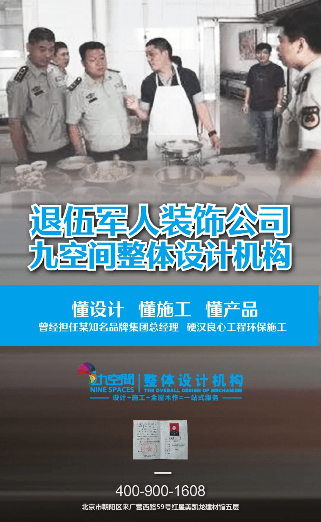 九空间整体设计机构体验馆创始人何朝富是一名不折不扣的,军队生活磨练他的意志品质,诚信、有原则、一身正气是他从当兵中获得的宝贵财富。何朝富经常说:“军队把我培养成了一个“硬汉子”,使我坚韧刚毅、勇敢正直、能忍受苦难与折磨,不怕失败、视死如归,所以我做的公司和别人都不一样,把“做人”放在第—,而不是“利益”。”因此收获了大小客户的认可。
