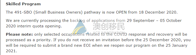 此次昆州只开放了技术移民类别491签证中的小生意通道类别,常规的技术移民491签证和190签证将在2021年1月25日再次开放。