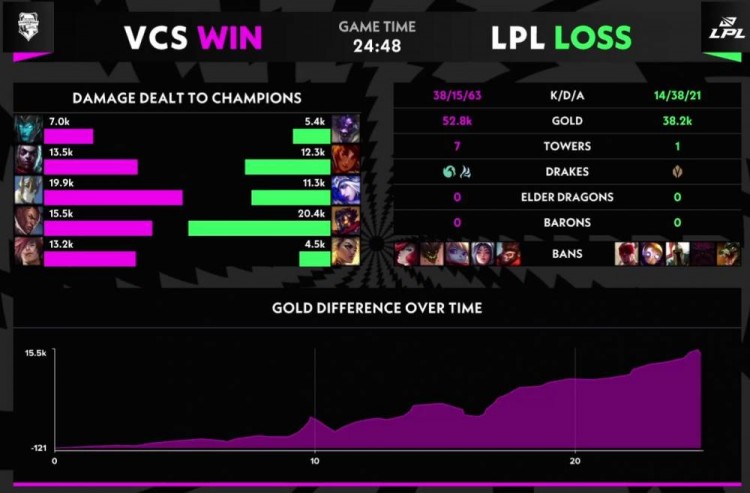 【22:50】LPL伺机而动,五人蹲伏草丛只抓到一个腕豪,伤害不足再被打出团灭(卡莉斯塔 0 距离传送看着队友把对面杀完了),VCS直接一波结束比赛。