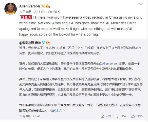 相关新闻:奔驰发布道歉声明:向艾弗森先生以及球迷朋友们诚恳道歉