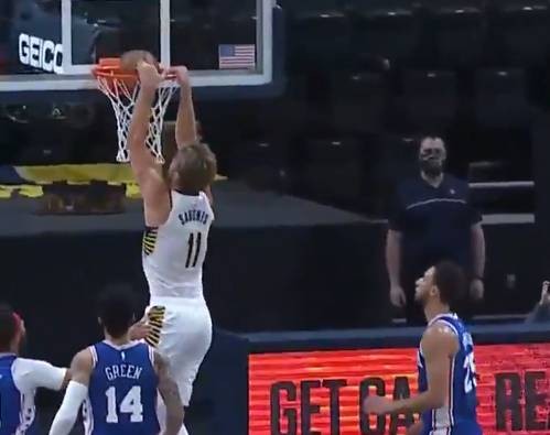 比赛第二节,奥拉迪波面对本-西蒙斯的防守,使出一记击地妙传,并成功穿过本西小门来到萨博尼斯手中,小萨在接球后随即双手暴扣砍分。