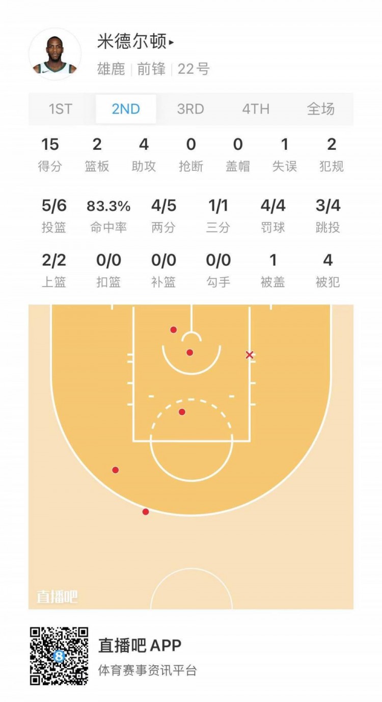 首节6投1中的米德尔顿在第二节找到手感,6投5中贡献15分2篮板4助攻,带队将分差从20多分迫近到只有2分。