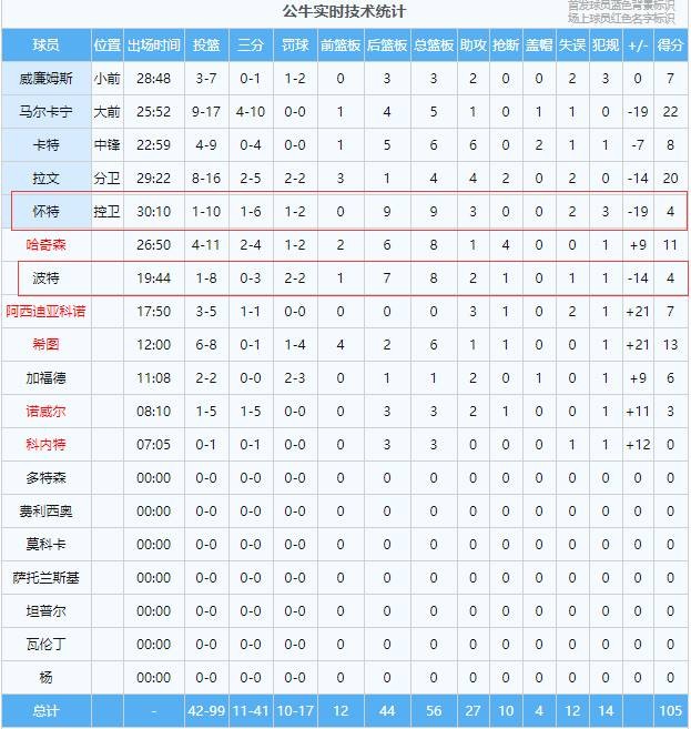 全场,怀特出战了30分10秒,投篮10中1,三分6中1仅得4分;波特出战19分44秒,投篮8中1,三分3中0得到4分8篮板2助攻1抢断。