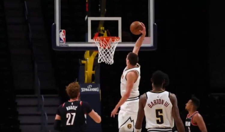 比赛中,掘金中锋约基奇上演一记漂亮的单手暴扣,随后掘金官推连发多条内容,夸赞这位当家球星的这一精彩表现:“太漂亮了,你需要看两遍!(或者三遍、四遍、五遍……你懂的)。”