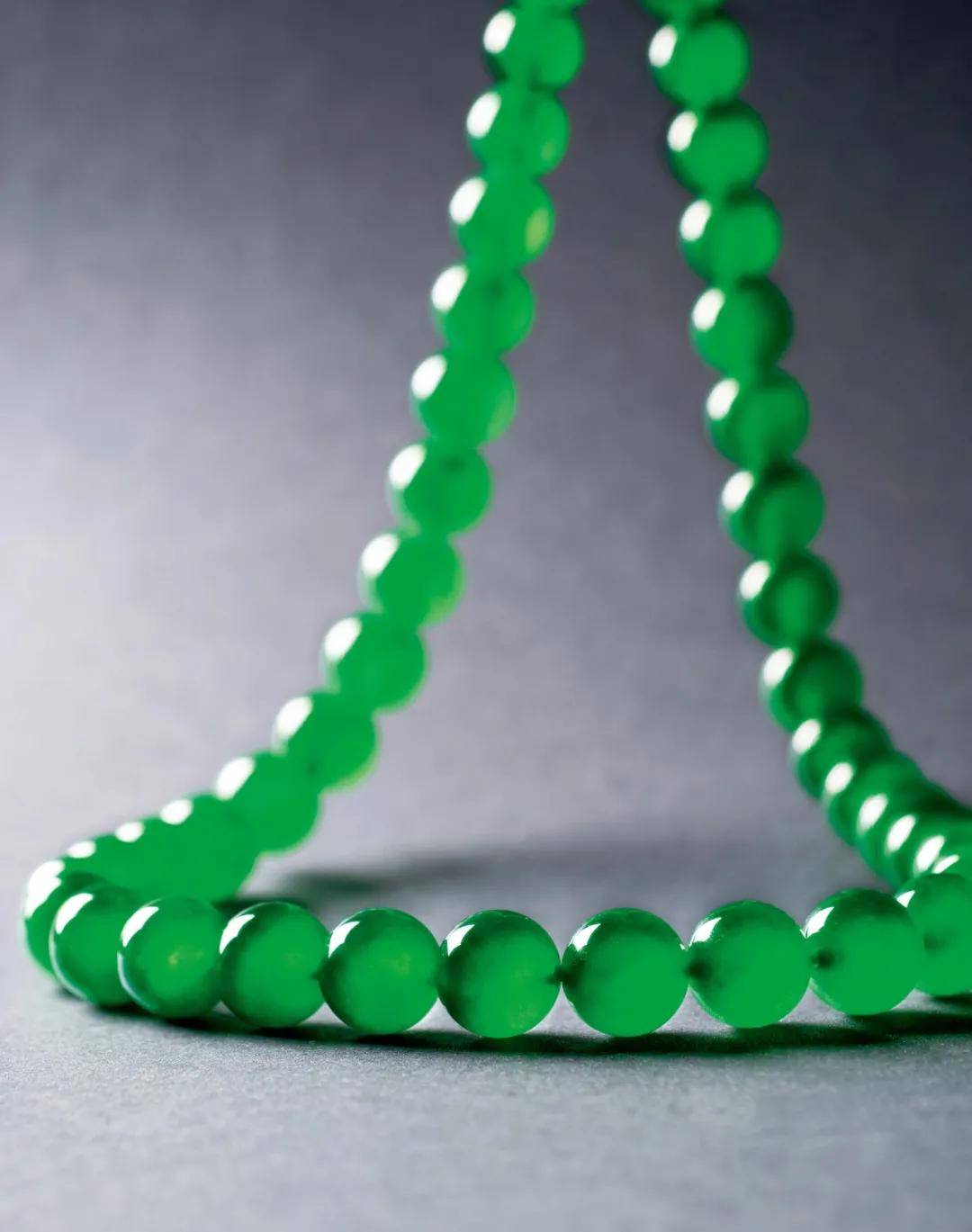 此条翡翠珠链,由硕大圆润的缅甸天然翡翠珠串连而成,色泽均匀,质地细腻,通体满翠,清亮似水,已属同类翡翠珠链的佼佼者。