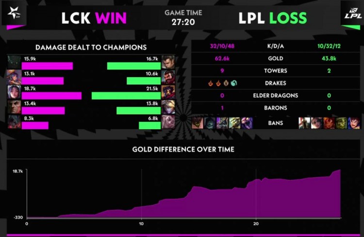 【14:02】LCK方在中路率先发难,LPL抵挡不住Canna派克打出三连斩,LCK直接团灭LPL。15分钟不到,LPL方落后接近12K。