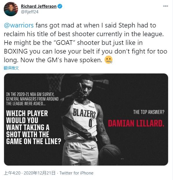 直播吧12月21日讯此前公布的2020-21赛季NBAGM调查结果中,在“关键时刻你会选择谁投篮”的选项中,获得最多选票的是利拉德。退役球员理查德-杰弗森发推:“我说库里需要重新夺回联盟如今最佳射手的