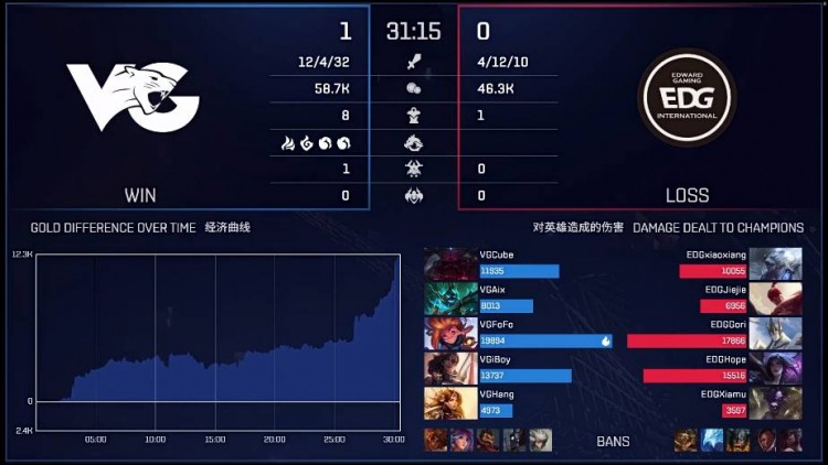 12月21日讯 今日德杯正式打响,本场对局将由VG对战EDG,在本场比赛中,Aix前期支援及时帮助Iboy在前期拿下三杀,中后期EDG无法处理莎弥拉,VG成功击败EDG拿下德杯四连胜,以全胜姿态晋级八强,同时同组的EDG、DYU、LEG、LNG无缘八强,确定淘汰。