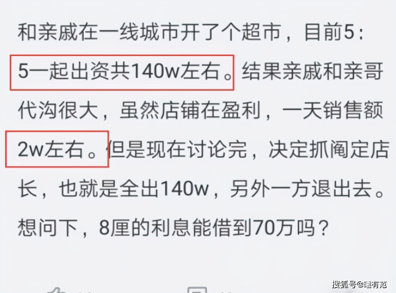 最近看到某一位网友在职场论坛上发了这么的一个帖子:他说自己和亲戚发140万合伙一起在老家开了一家超市,每个月的营业额还不错,大概在2万左右,后来生意慢慢变好了,火了起来,却没有想到亲戚让他退出给他70万让他退出,结果蒙了! 到底是怎么回事呢?