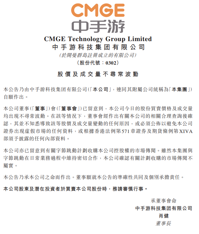 12月22日,中手游在港交所发布公告称,留意到有关字节跳动计划收购公司控股权的市场传闻,确认有关计划收购的市场传闻不属实。