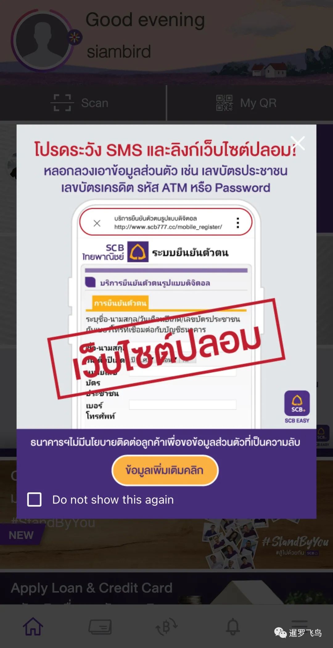 他们的诈骗手段,其实很老套,但在泰国还很新鲜。泰国人没见过这样的诈骗方式,导致很多人中招!滙商银行不得不在网站和自家手机银行开屏广告警示用户防止被骗。