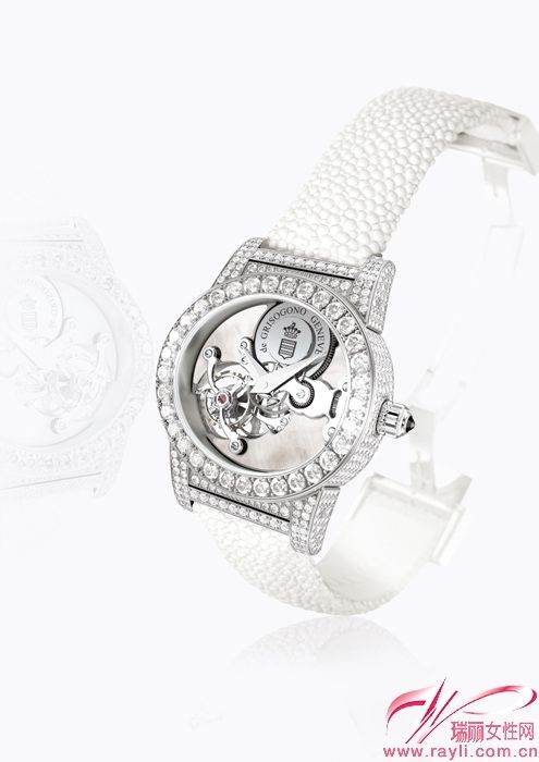 在今年的巴塞尔钟表珠宝展上,de GRISOGONO将带来镶满完美白钻的Tondo陀飞轮珠宝腕表,这也是这个来自瑞士的高级珠宝腕表品牌首次专为女性设计的一款拥有偏心陀飞轮的珠宝腕表。