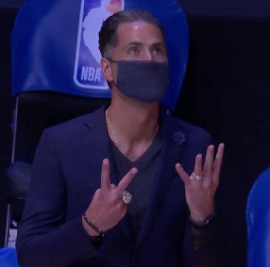 总经理佩林卡领取戒指之后用手比出了“2”、“4”的手势,致敬已逝的湖人名宿科比。