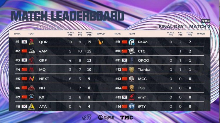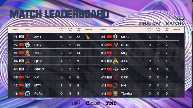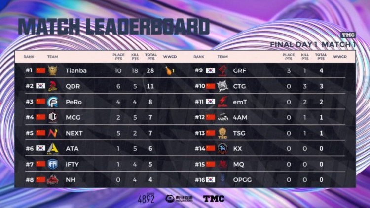 12月23日讯 虎牙天命杯S8为期三日的决赛已经开始,首日六局比赛分别由Tianba、QDR、GRF、4AM、OPGG、emT(按场次顺序)完成吃鸡。