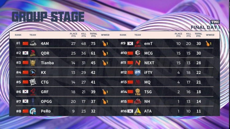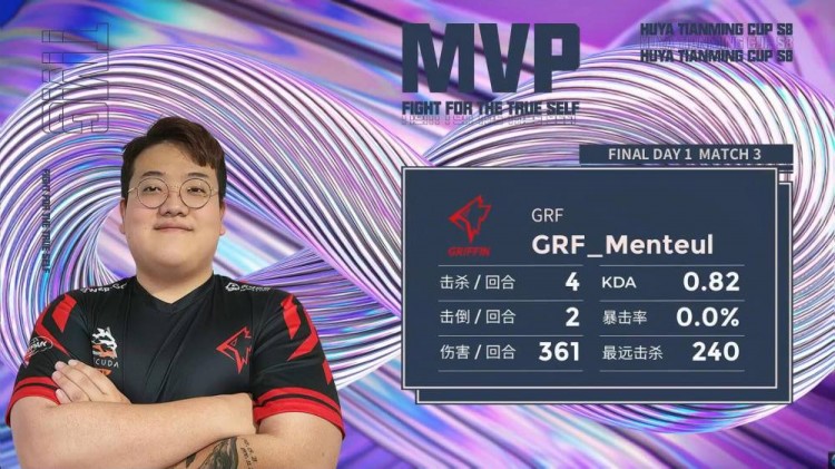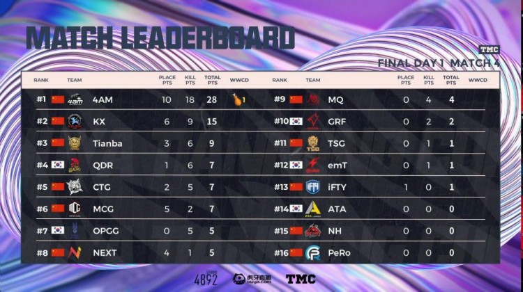 海岛图决赛圈四支队伍,GRF 满编,OP.GG 三人, 4AM、QDR 都是两人编制,圈 7 刷新,4AM 和 GRF 打靶将 QDR 和 IOP.GG 淘汰,最终 GRF 4 打 2 4AM,4AM 双人拉开包夹 GRF4 人,连续击倒 GRF2 人,小鹿被打掉,韦神 1 打 2 打掉一人 惜败!
