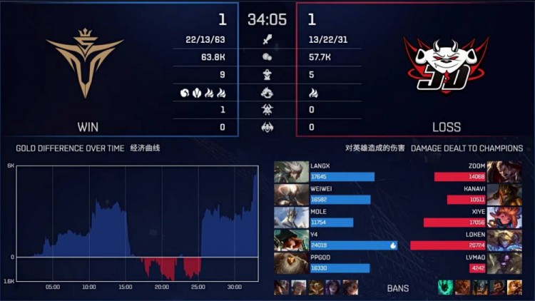 【22:00】JDG野区与V5混战,腕豪虽然被打残但是一个满豪意W打出巨额伤害,JDG一拥而上团灭V5随后一波结束比赛。