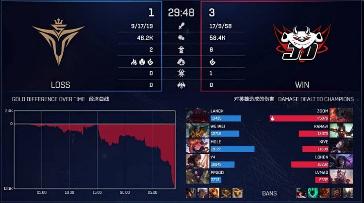 【19:50】JDG入侵野区追到下路二塔附近,佐伊极限距离Q技能直接打死发条,V5一拥而上,莎米拉大招打足伤害,V5完成0换3。