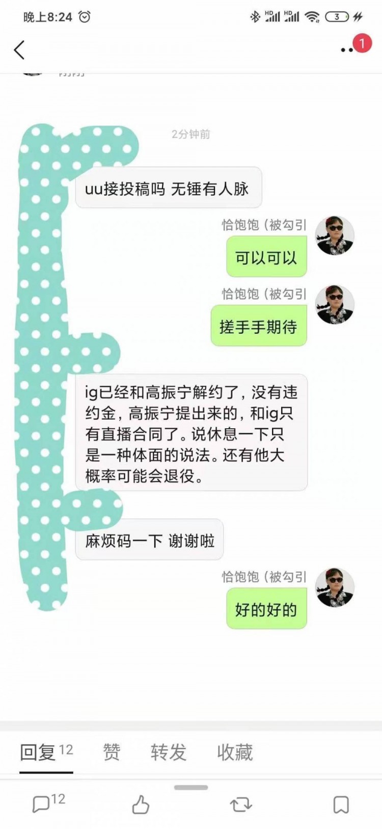 “IG已经和高振宁解约了,没有违约金,高振宁提出来的,和IG只有直播合同了。说休息一下只是一种体面的说法。还有他大概率可能会退役。”