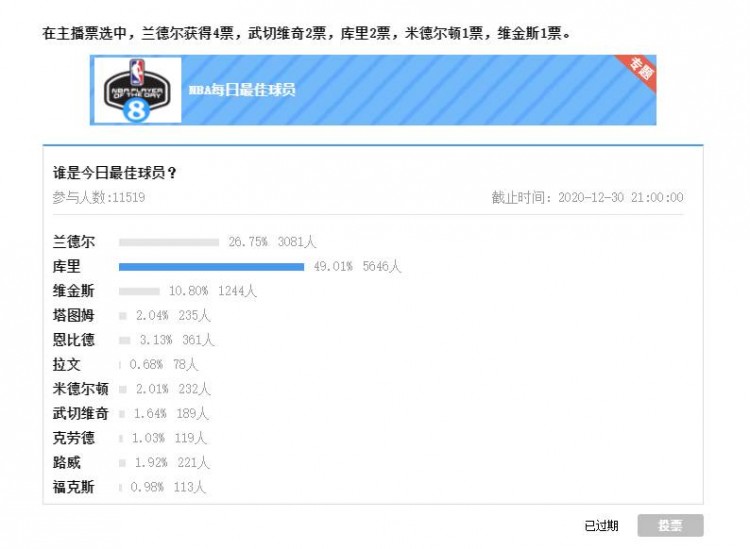 投票结果显示,库里的得票率为40.307%,击败兰德尔(30.725%)当选今日最佳球员。