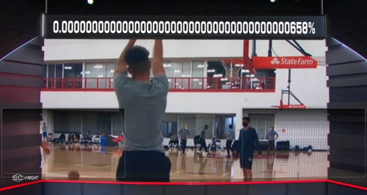 美媒SportsCenter今日根据过去五年NBA底角空位三分的命中率(41.4%),计算出了连续投中105个底角三分的平均概率——6.58*10^ (-41),具体有多少个零请看上图,并且零太多标题写不下,各位吧友们请见谅。