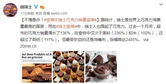 瑞士民众疫情中囤巧克力 销量涨幅超厕纸2020-03-29 12:04:45 微博3月29日讯 多个国家加入了抗疫行列,民众也开始了囤货行动。据