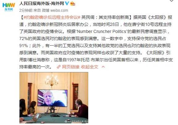 《太阳报》引用彭博社消息称,这是自1997年托尼-布莱尔出任英国首相以来,历任英首相中支持率最高的一次。