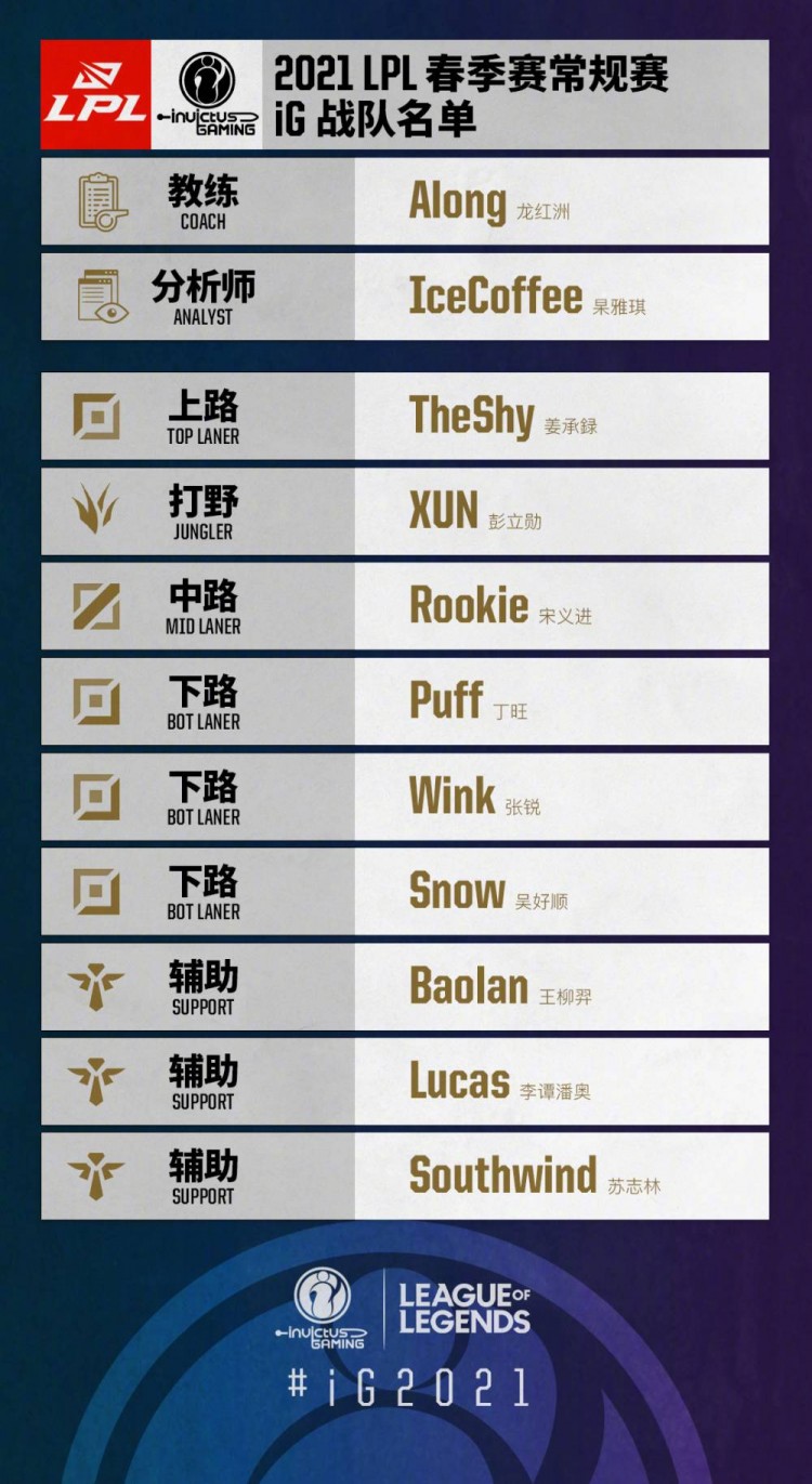【iG电子竞技俱乐部英雄联盟分部2021LPL春季赛名单】