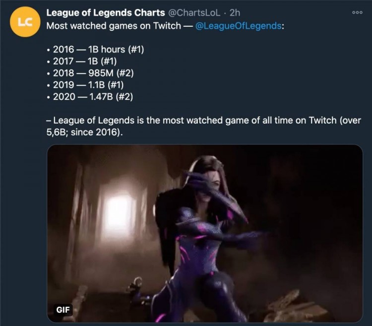 英雄联盟也是Twitch上有史以来观看时长最长的游戏,自2016年以来总时长已经超过56亿小时。